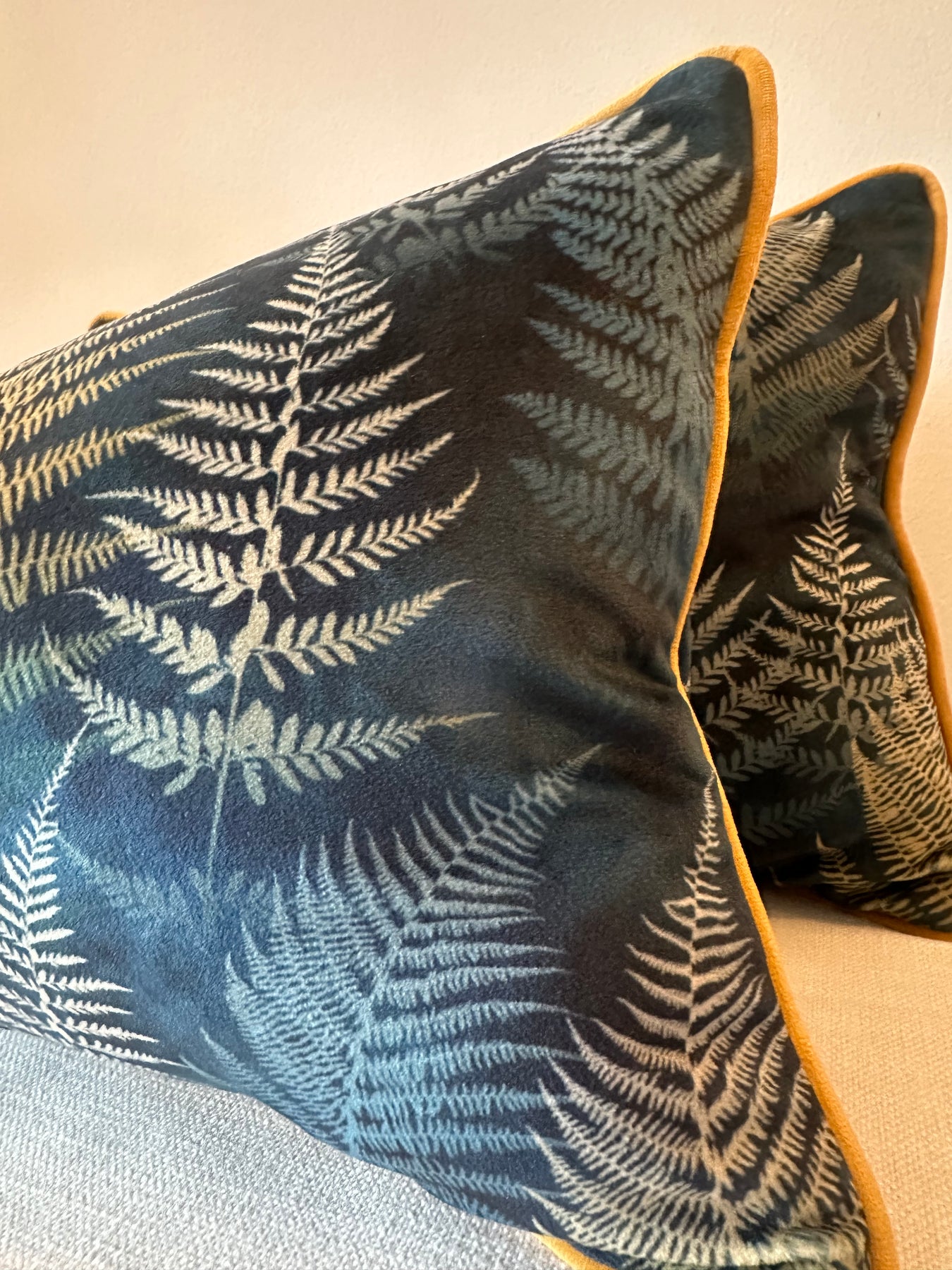 Two 50cm x 30cm Cushion Covers. Clarissa Hulse - Woodland Fern -Ink. Piped with Amber Velvet.
