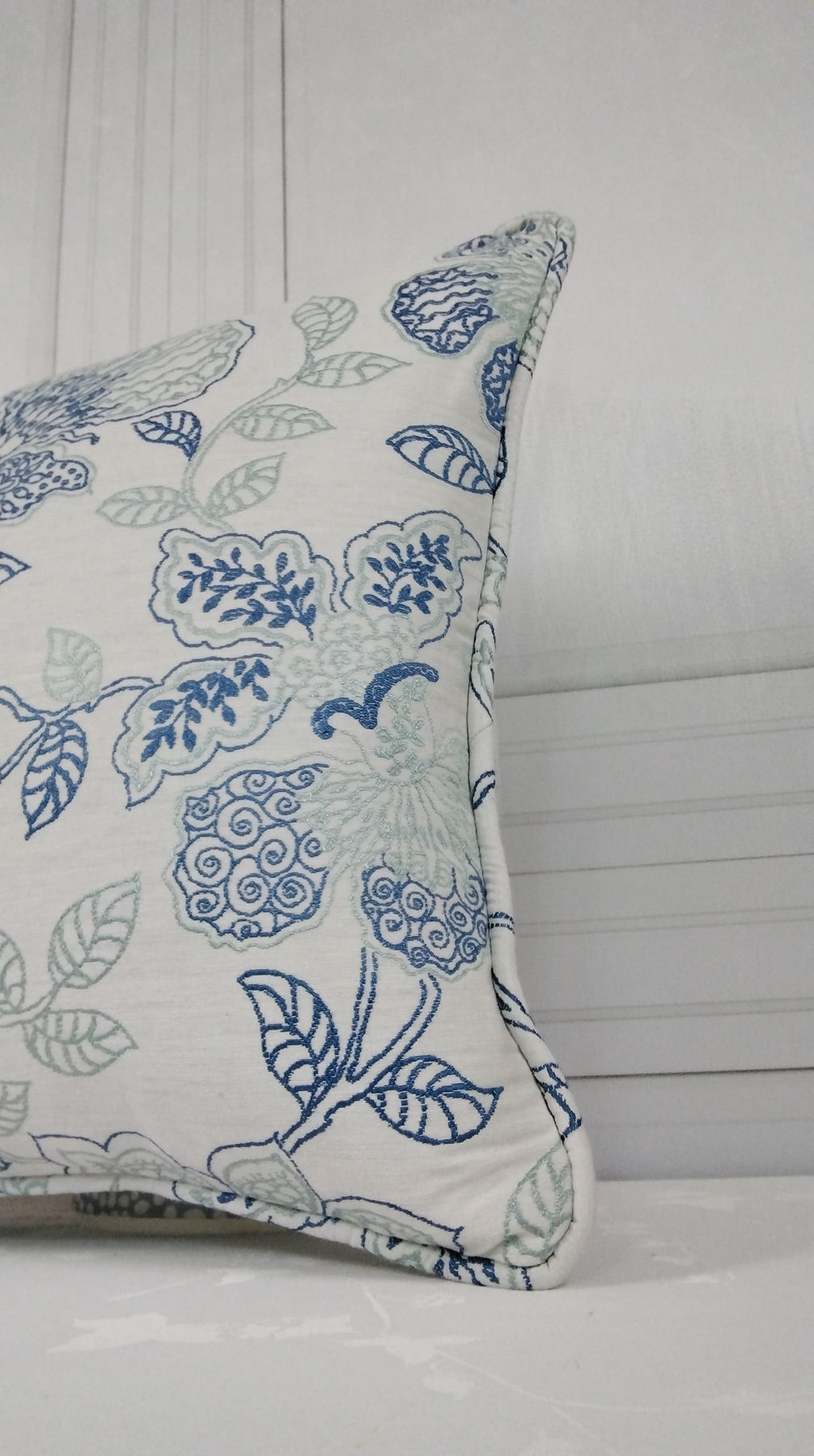 A pretty embroidered cushion, made from one of our Swaffer fabrics. Self piped, has a concealed zip closure to the reverse, all seems are overlocked and comes complete with a British or European feather insert. Available in two colour ways blue/cream or pink/cream. Three square sizes are listed. But other sizes and styles are available. Please ask.