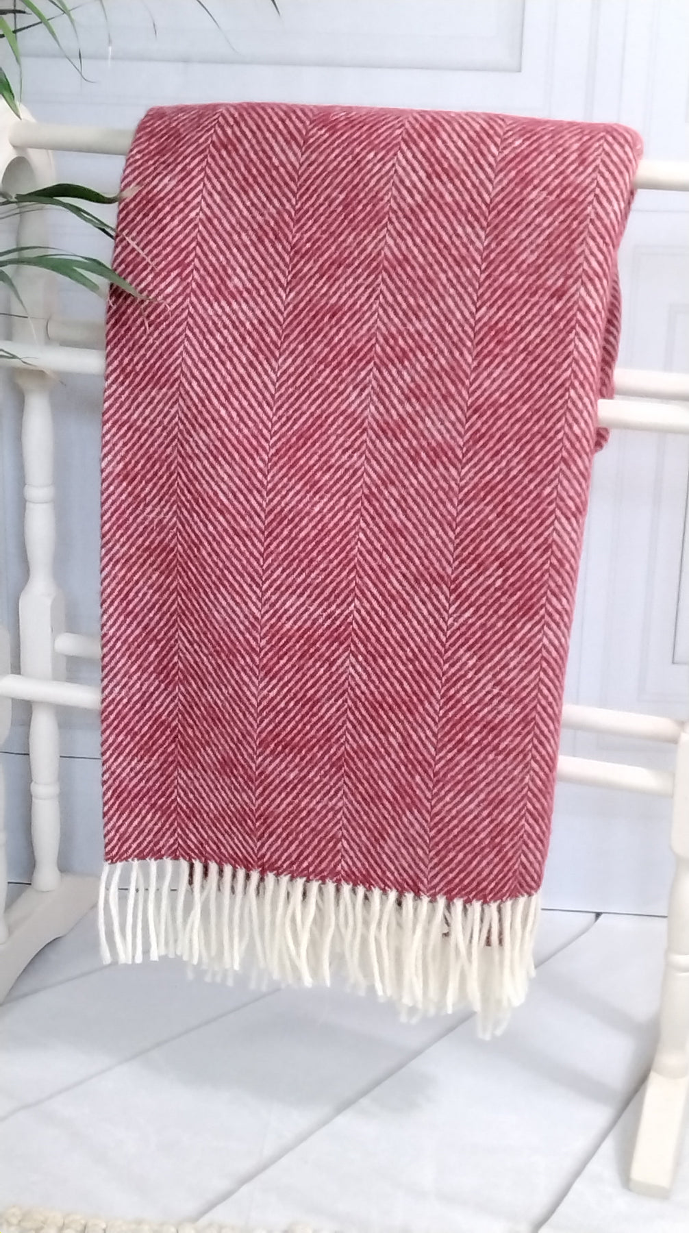 A raspberry and cream herringbone throw. Made from pure new wool. Perfect draping over a sofa, arm chair or bed. British made, washable by hand. Measures 130cm x 190cm