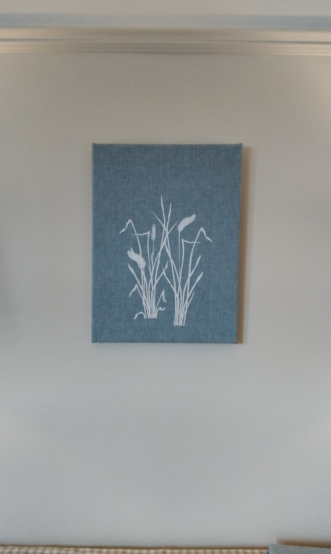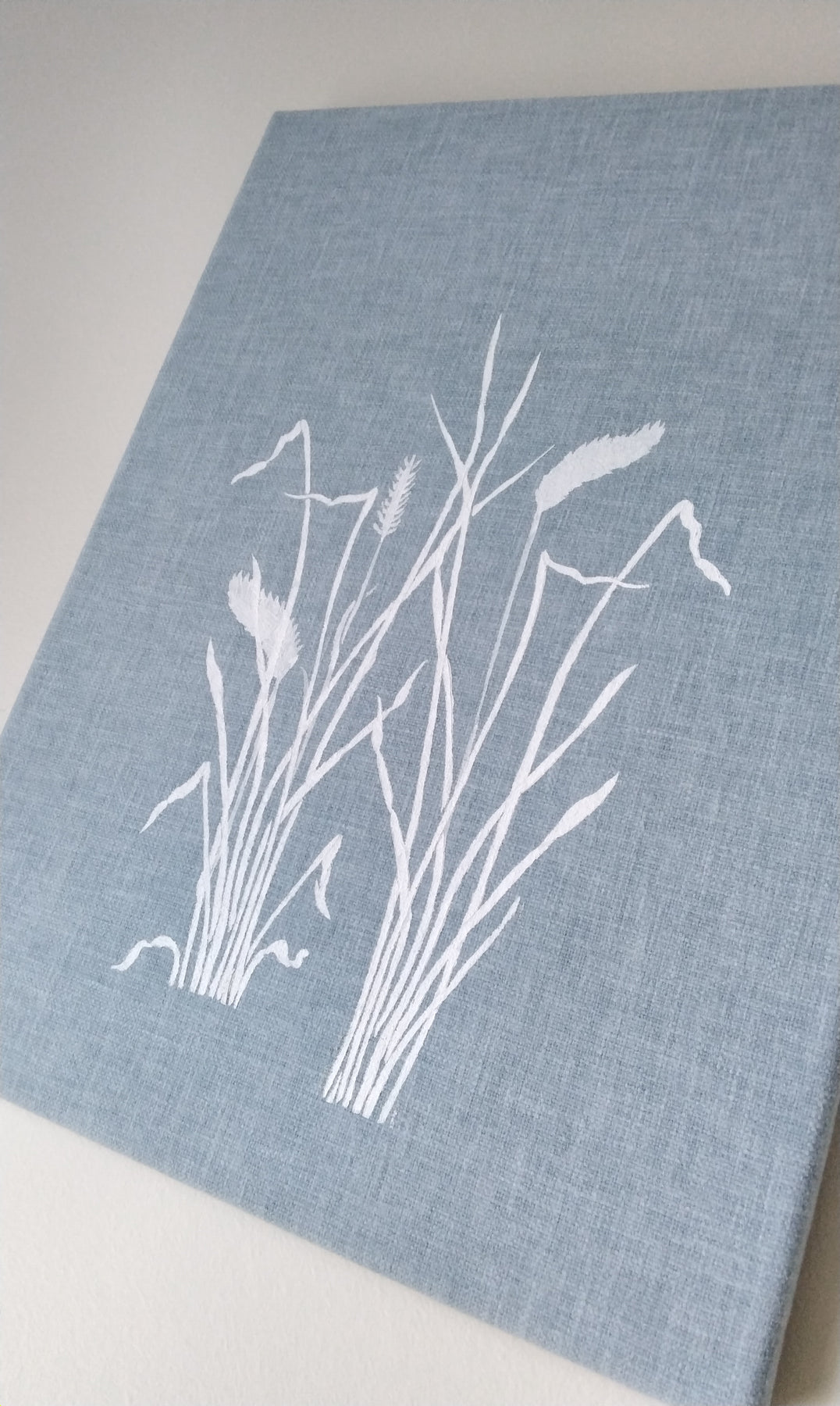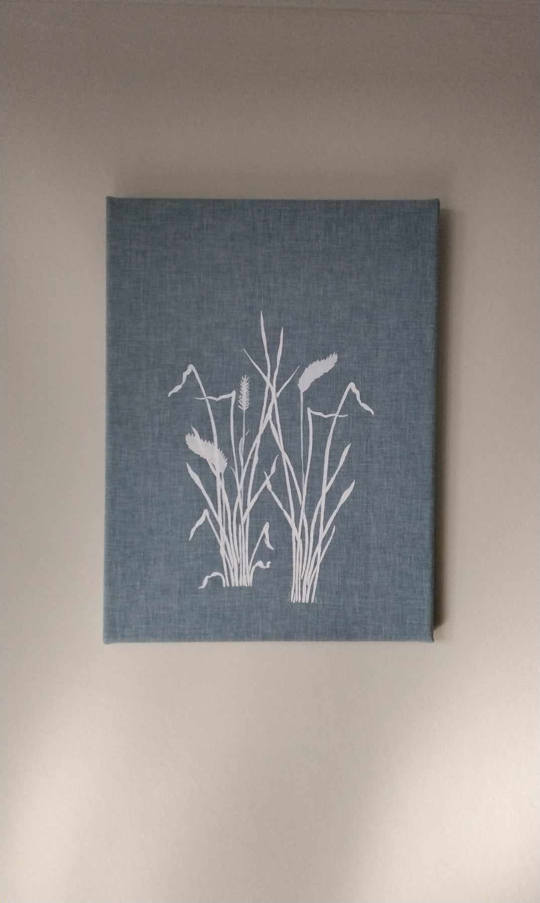 Wild grasses painted by hand on a Duck egg blue cotton fabric, mounted onto a wooden frame. Comes ready to hang on a wall of your choice. Measures 16" x 12"